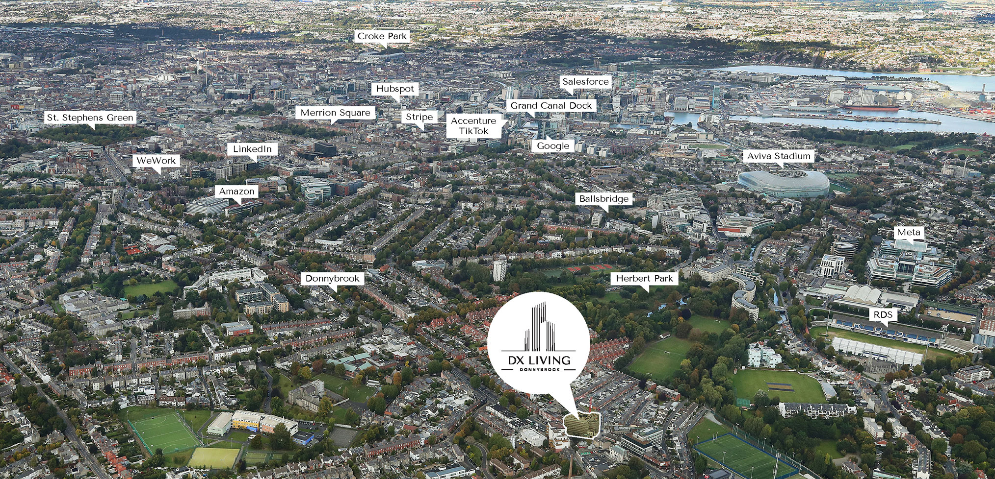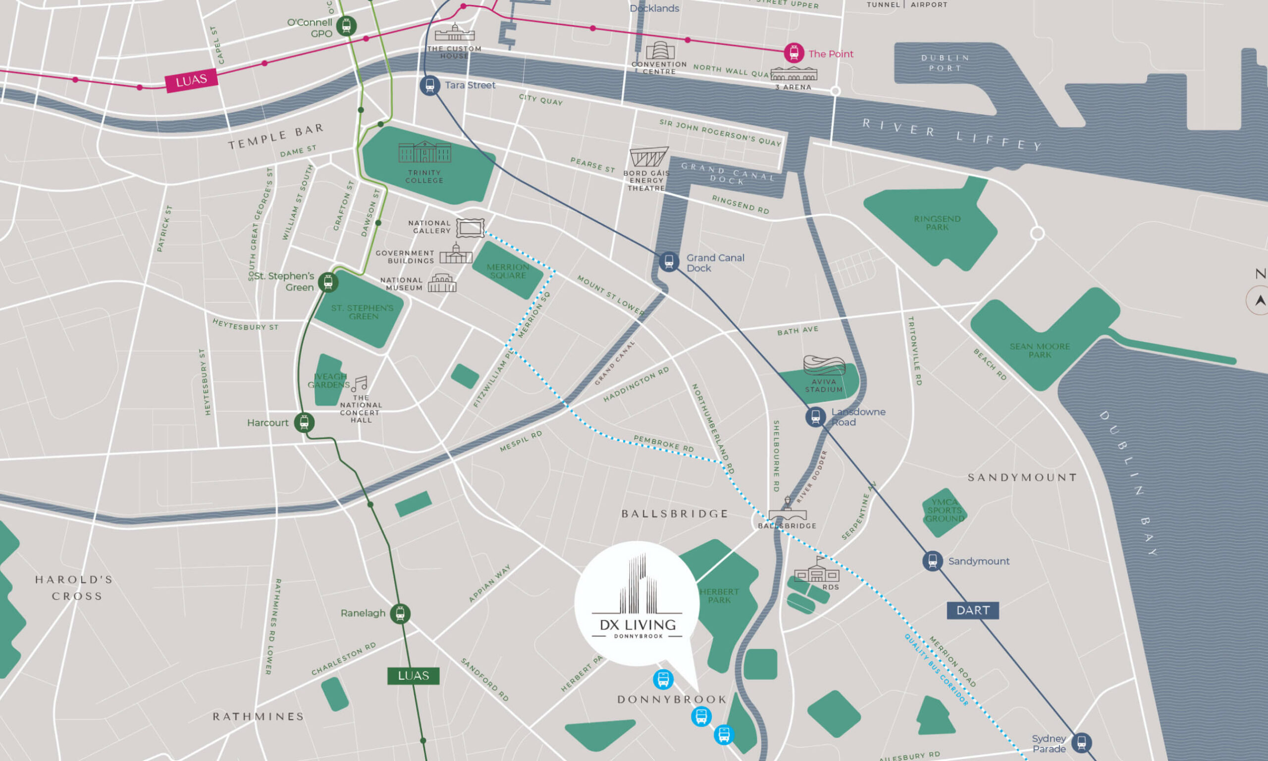 Also convenient, Dublin’s Grand Canal Dock is only 2.1km and 11 minutes cycle / 30 minutes’ walk from DX Living Donnybrook.